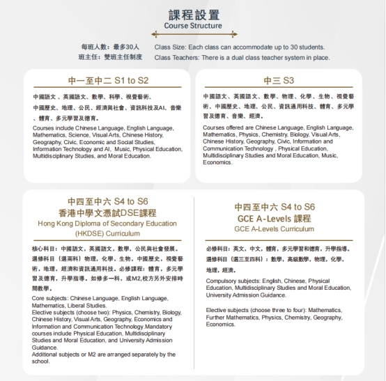 课程方面,初中阶段(中一至中三)采用香港学校初中全英语课程,融合香港课程与校本特色教学内容;高中阶段(中四至中六)则提供DSE课程及A-Level课程,分别对接香港大学、内地211/985高校及全球顶尖学府。